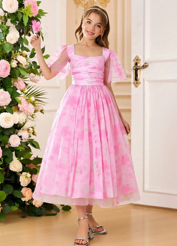 Елегантна вечірня сукня для дівчаток синього кольору. Сукня А-силуету, що підкреслює фігуру. Круглий виріз горловини та короткі рукави. Розкльошений поділ та висока талія. Матеріал – 100% поліестер, що не тягнеться. Рекомендації щодо догляду: прання машини або професійна хімчистка.
