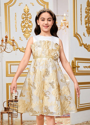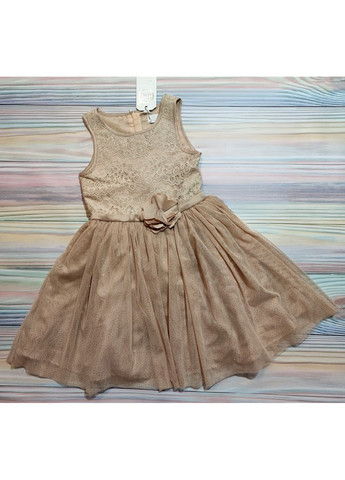 Чарівна святкова сукня для дівчинки золотистого кольору перетворить вашу принцесу на справжню фею! Верх виконаний з витонченого мережива, а пишна спідниця складається з декількох шарів тюлю з блискучим напиленням (глітером), що створює ефект зоряного сяйва. Атласний пояс прикрашений об'ємною квіткою, ідеально підкреслюючи талію.