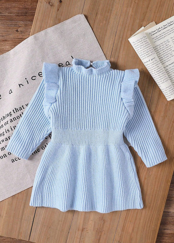 Сукня для дівчинки має комір-стійку та довгі рукави. Він виготовлений із еластичної тканини. Сукня має розкльошений низ та природну лінію талії. Простий дизайн.