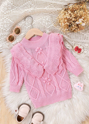 Ніжне в’язане плаття для дівчинки у красивому рожевому кольорі. Виконане з м’якої пряжі, що забезпечує комфорт і тепло у прохолодну пору року. Декороване акуратними візерунками «косичками», квіточкою та бантиком на талії. Має довгий рукав і елегантний хвилястий низ. Підійде як для щоденного носіння, так і для святкових подій. Переваги: для дівчинки; ніжний рожевий колір; в’язаний дизайн із візерунками; довгий рукав; прикрашене квіткою та бантиком; універсальний варіант — на кожен день чи свято.