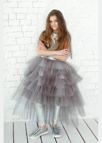 Святкова сукня з пишною спідницею для дівчинки, сірого кольору. Верх сукні вигтовлен з єкошкіри, декорован пайетками. Спідниці пишна з євросітки, різної довжини (попереду коротше).Застібається на блискавку на спинці. Склад 100% поліесте, підкладка 100% бавовна.