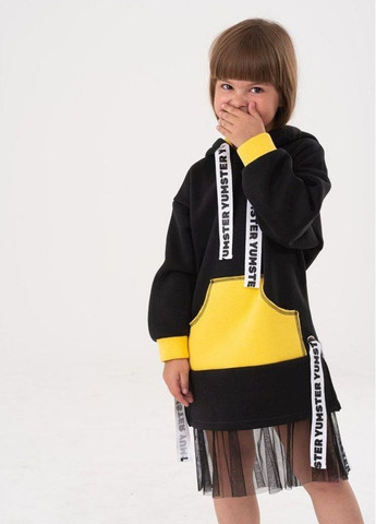 Трикотажне плаття з капюшоном і фатином. Для дівчаток від 5 до 15 років. Деталі: Плаття чорного кольору з капюшоном. На рукавах - жовті манжети. Накладні кишені спереду. Поділ плаття прикрашений фатином. Біла тасьма з принтом "Yumster". Склад: бавовна 90%, поліестер 10% *Відтінок кольору на фотографії може відрізнятися від реального