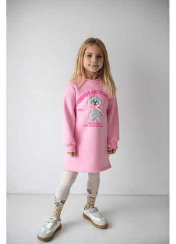 Сукня з полегшеного футера та легінси із трикотажу. Сукня з довгим рукавом реглан, кнопками ззаду на одному плечі та плавно округленим подолом з короткими розрізами з боків. Легінси з гумкою на талії та набивним малюнком. Можливе пошкодження бирки.