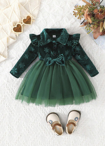 Ця сукня стане ідеальним вибором для новорічних ранків, дитячих свят, фотосесій та сімейних урочистостей. • Універсальний варіант – підходить і для свята у садочку, і для родинного вечора. • Практичність: довгий рукав зігріє взимку, а м’яка тканина не подразнює ніжну шкіру. • Економія часу – сукня вже виглядає як готовий святковий образ. • Два стильні кольори: глибокий смарагдовий (як на фото) та вишнево-червоний. Особливості: • Верх із м’якого оксамиту – теплий і комфортний. • Спідниця з фатину зі «зірочками» – гарно сяє при світлі. • Атласний пояс робить силует витонченим.