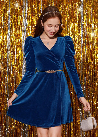 Елегантна сукня для дівчаток-підлітків. Це синя сукня з V-подібним вирізом та рукавами-ліхтариками. Підходить для випускного та вечірок. Сукня має стандартний крій і трохи тягнеться. Вона має високу талію та розкльошений поділ. Застібка-блискавка завершує дизайн.