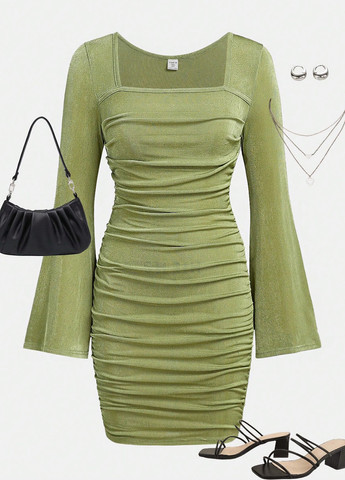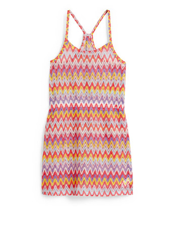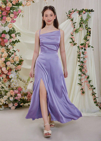 Сукня-кльош підліткова, однотонна, відрізна по лінії талії, ззаду застібка на блискавці, круглий виріз горловини, без рукавів, проймання фасону "реглан". На розмір М/14: ПОГ – 43 см, ПОТ – 40 см, довжина по спинці – 81 см.