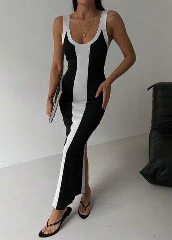 Трикотажна сукня в смужку. З боків розрізи. Дві прорізні кишені.