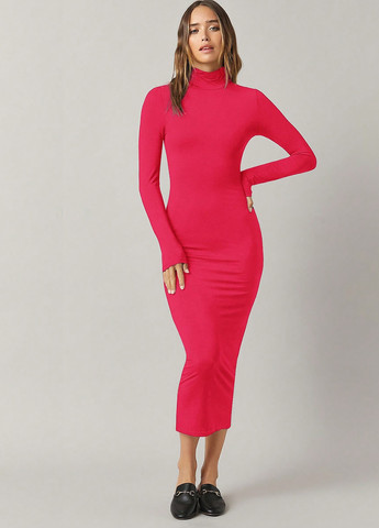 Однотонна сукня червоного кольору з високим горлом зі штучним вирізом, виготовлена з легкої еластичної тканини. Має довгий рукав звичайної посадки та природну лінію талії. Поділ має форму олівця та високий виріз, що робить його елегантним, приталеним дизайном.