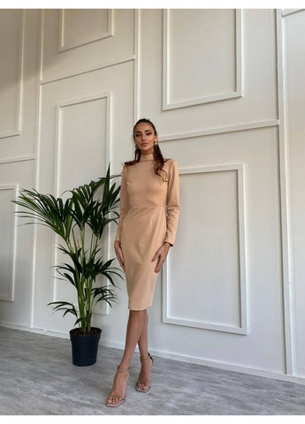 Вигляд виробу: пряма сукня - футляр, у довжині мідл-максі, зі знімним поясом на декоративній пряжці. Силует, довжина: прилеглий, прямий. Посадка по лінії талії: класична. Щільність та вид тканини: середньої щільності, фактурний, трикотажний матеріал. Вид застібки: блискавка. Наявність підкладки: присутня. Наявність та вид кишень: відсутні. Виріз горловини: круглий. Вид рукава: гачкова. Догляд за виробом: Делікатне, швидке, ручне прання при 30 градусах, без використання агресивних миючих засобів.