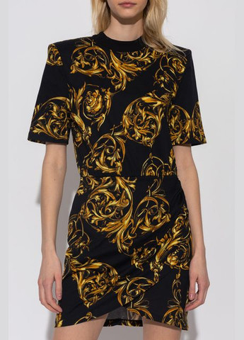 Versace_(001407) Сукня чорна в принт від італійського бренда. Комір круглий, рукав короткий вшитий, на плечах поролонові підплічники, пояс на резинці, спереду крій асиметричний та оригінально призібраний. Країна бренда та виробництва - Італія.
