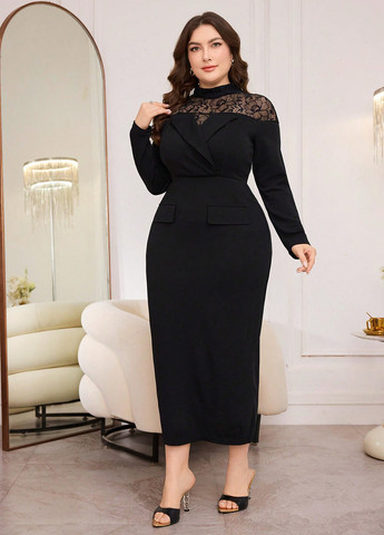 Елегантна сукня Modelyn Plus Size з високою талією та приталеним силуетом. Сукня чорного кольору та подовженої довжини. Сукня доповнена контрастним мереживом та застібкою-блискавкою. Матеріал – високоеластичний трикотаж.