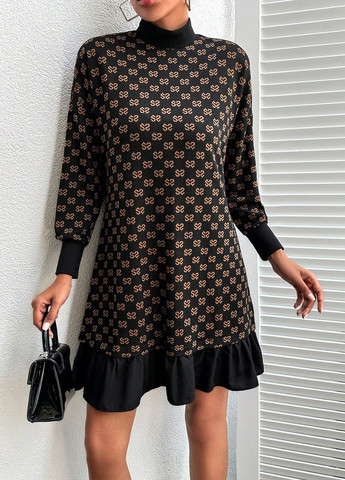 Наша повсякденна сукня-комбінезон із заниженою талією, оборками та довгим рукавом у формі бішкету. Повний принт виготовлений із злегка пружної тканини. Ця сукня довжиною до коліна, доступна в чорному кольорі, має виріз горловини зі стійкою та стандартною посадкою.