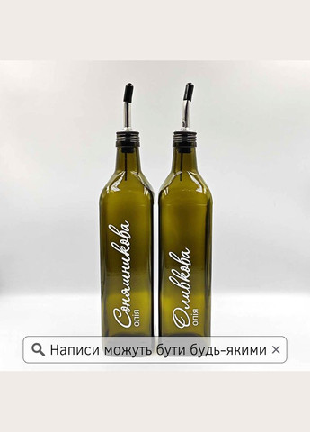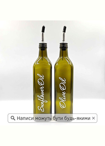 Пляшки для олії, оцту, різних соусів і маринадів Скляні пляшки для олії — це не тільки стильний аксесуар для кухні, але й корисний інструмент для дозування та зберігання різних типів рослинної олії, оцту, домашніх настоянок або маринадів. Вони забезпечують точність додавання інгредієнтів до страв, а завдяки написам на пляшці дають змогу легко відрізнити різні види олії й оцту з маркування. Скляні пляшки також допомагають зберігати олії у свіжо-тривалий період часу. Виріб має гладку поверхню, не вбирає запахи, легко миється. У наборі 2 пляшки з дозаторами та дерев'яною підставкою. Не підходять для миття у посудомийній машині! Догляд: будь-які миючи засоби. Не мийте дряпаючими абразивними засобами. Не використовуйте металізовані або жорсткі серветки і щітки. Для збереження блиску, після миття протирайте сухим м'яким рушником. Розміри: Висота з дозатором 34 см Ширина 6,7 см Матеріал: скло. Форма: квадрат. Об'єм: 750 мл. Розмір підставки: 17,3 х 9,7 см (дуб). Варіанти написів: Рослинна олія Соняшникова олія Оливкова олія Кунжутна олія Лляна олія Кукурудзяна олія Конопляна олія Мигдальна олія Олія обліпихи Гарбузова олія Пальмова олія Гірчична олія Уксус Винний оцет Яблучний оцет Бальзамічний оцет Рисовий оцет Соєвий соус Не знайшли потрібний напис? Просто пишіть нам і ми втілимо Ваші побажання в життя. Ємності можуть бути і без написів.