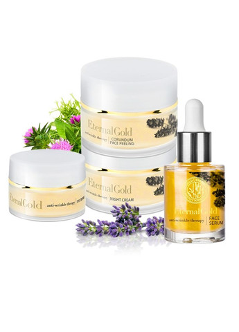 Основне призначення денного крему – захистити шкіру від зовнішніх факторів і забезпечити зволоження, яке супроводжуватиме нас протягом дня. У випадку денного крему також важливо, щоб він був легким і швидко вбирався, залишаючи шкіру м’якою та сяючою.Денний крем Eternal Gold містить Xeradin - екстракт шавлії мускатної, рослини, яка має здатність накопичувати велику кількість води та утримувати її. Ці властивості також використовуються в денному кремі, який допомагає підтримувати належний рівень зволоження шкіри та запобігає його втраті. Освітлюючі частинки, що містяться в кремі, оптично зменшують зморшки та додають сяйва обличчю, а екстракт іспанської лаванди забезпечує швидкий ефект ботокса, зменшуючи напругу на обличчі.Набір косметики, що містить денний і нічний крем проти зморшок