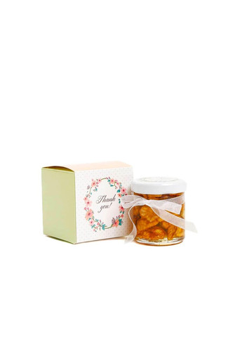 Бонбоньєрка для гостей. Бонбоньєрка - це подарунок для гостей як подяка близьким та рідним, які прийшли до Вас на свято, сімейний захід. Таким чудовим подарунком може послужити маленька баночка 50 г кеш'ю з натуральним медом, з нашої власної пасіки. Така баночка прикрашена стрічкою. Додатково Ви можете замовити іменні наліпки на верхню частину кришечки. Об'єм - 42 мл