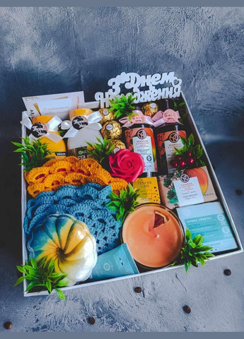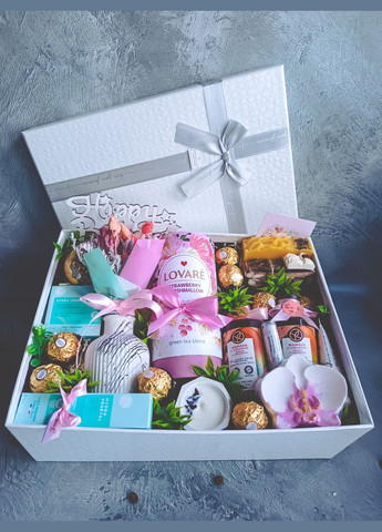 До складу набору входить коричневий дерев'яний бокс з наповнювачем, аромадифузор English Home, аромасаше English Home, мило English Home, спрей для дому English Home, рушник English Home, бомбочка для ванни, скраб для тіла, свічка з вощини, лавандова карамель Tvoya Banka, шоколадне серце, цукерки Zaini, мильні троянди, замшевий мішечок. Подарунковий набір Lavender Dreams, подарунок на день народження, день матері, день захисту дітей, весілля, ювілей, річницю, лікарю, вчителю, колезі, начальнику, шефу, партнеру, жінці, дружині, дівчині, дівчинці, подрузі, сестрі, мамі.