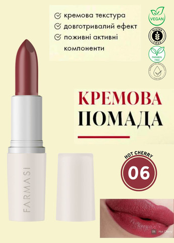 Розкішна, атласна помада із повним покриттям. Наповнений живильними активними компонентами, робить губи м'якшими, зволоженими та просто красивими. Антиперідна, залишається на місці і не тече. Формула забезпечує комфортне відчуття та кремове покриття – для гладких та красивих губ. Поступово наноситься, розгладжуючи шкіру губ. Інтенсивно зволожує та насичує кольором. Містить активні живильні компоненти: - олія Ши пом'якшує, захищає, відновлює та усуває лущення ніжної шкіри губ; - батер (масло) Кокум відновлює гідроліпідний баланс шкіри губ, зволожує її, сприяє регенерації та запобігає сухості, відновлює пошкоджені міжклітинні оболонки шкіри, відновлює пружність та захищає від шкідливого впливу навколишнього середовища; - Сквален відновлює пошкоджену шкіру, допомагає утримувати вологу, добре пом'якшує та заспокоює шкіру губ, має антиоксидантний та легкий антибактеріальний ефект. Не розмазується. Не містить парабени, ароматизатори та шкідливі компоненти. Колекція кремових помад для губ Farmasi має широку палітру відтінків, підійде для будь-якого макіяжу і на будь-який випадок життя. Від ніжних та натуральних до яскравих та відтінків. Вибирайте улюблені відтінки та створюйте свої образи. Кожна помада упакована у стильний футляр, який зручно брати із собою у сумочку чи на святковий макіяж. Помада має стійкість, вона практично не змивається при їжі або питві і витримує до 6 годин на губах. Вона також не скочується і не залишає слідів на одязі. Завдяки своїй кремовій текстурі помада легко наноситься і не залишає відчуття сухості або стягнутості на губах. Ваші губи будуть виглядати доглянутими та спокусливими протягом усього дня. Кремова помада для губ Farmasi має приємний ненав'язливий аромат, який надає їй особливої ​​нотки елегантності. Всі відтінки помади можна використовувати як самостійно, так і поєднувати, створюючи унікальний колір. Цей продукт має високу якість і доступну ціну, тому легко можна спробувати кілька відтінків для різноманітності у своєму макіяжі. Зробіть свої губи м'якшими, зволоженими та красивими з кремовою помадою для губ Farmasi. Не чекайте і ухваліть рішення зробити свій образ ще більш досконалим та привабливим прямо зараз! Склад: Octyldodecanol, Isononyl Isononanoate, Paraffin, Octyldodecyl Stearoyl Stearate, Synthetic Fluorphlogopite, Silica, Bis-Diglyceryl Polyacyladipate-2, Copernicia Cerifera (Carnauba) WaxCera CarnaubaCire De Carnau lin, Squalene, Microcrystalline Wax Cera MicrocristallinaCire Microcristalline, Zeolite, Caprylic/Capric Triglyceride, Ozokerite, Butyrospermum Parkii Butter, Garcinia Indica Seed Butter, Polyethylene, Flavour/Aroma, Tocopheryl Acetate, Tocopherol, Ricinus Communis (Castor) Seed Oil, Sotor [+/- May Contain: Titanium Dioxide/CI 77891, FD&C Yellow No. 5/CI 19140, D&C Red No. 7/CI 15850, Iron Oxides/CI 77491, CI 77492, CI 77499, D&C Red No. 6/CI 15850, D&C Red No. 34/CI 15880.]