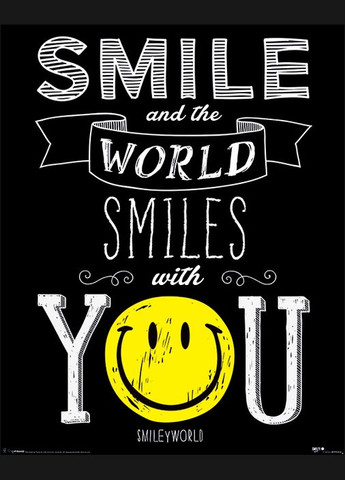 Посмішка найчастіше автоматично викликає відповідну посмішку і піднімає настрій, навіть якщо це всього лише жовта посміхаюча пика на чорному фоні, яка зображена на цьому постері. А якщо вона оточена надзвичайно позитивним гаслом «Smile and The World Smiles With You» (посміхайся і світ посміхнеться з тобою), то у поганого настрою поряд з таким плакатом немає ні найменших шансів на існування. Ймовірно, тому постер «Smile» - це відмінний спосіб наповнити будь-яку кімнату атмосферою дружелюбності, в якій бурлить позитивна енергія. Яскравий постер - це ідеальний спосіб доповнити інтер'єр приміщення, а також створити певну атмосферу і підкреслити індивідуальність, що живуть або працюють в ньому людей. Пропоновані в нашому магазині плакати представляють собою ліцензійну продукцію від англійського виробника. Тобто на їх випуск отримано офіційний дозвіл правовласника. Це важливо як з точки зору законності, так і з точки зору оплати роботи художників, фотографів і дизайнерів, які працювали над створенням постерів. Для їх виготовлення використовується спеціальна високоякісний папір щільністю 150 г/м². Зображення наноситься методом 3-шарової літографічної друку, який дозволяє добитися ідеальної передачі кольору, щільності і насиченості кольору і чіткої, якісної графіки. Крім незаперечних естетичних якостей у плакатів є ще одна важлива перевага - їх дуже просто повісити або, при необхідності, зняти. У нашому інтернет-магазині без проблем можна знайти постер, який органічно впишеться в загальну стилістику інтер'єру і зробить його більш живим.