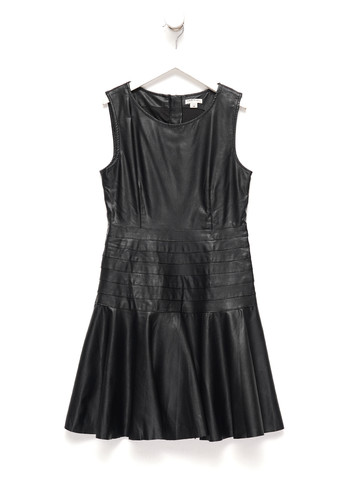 Сукня кльош однотонна, м'яка штучна шкіра, на підкладці, застібка на блискавці, круглий виріз горловини, без рукавів, без кишень.