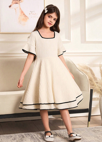 Ця сукня SHEIN Tween для дівчаток з квадратним вирізом і розкльошеними рукавами-дзвіночками. Сукня має високу талію та А-силует. Вона виготовлена із високоеластичного поліестеру. Рекомендується машинне прання або професійна хімчистка.