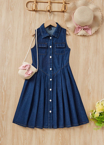 Це джинсове сукня для дівчаток. Воно має високу талію та розкльошений низ. Сукня пошита із сумішевої джинсової тканини. Складки та застібка на гудзики спереду. Стиль елегантний та невимушений. Сукня без рукавів та короткої довжини.