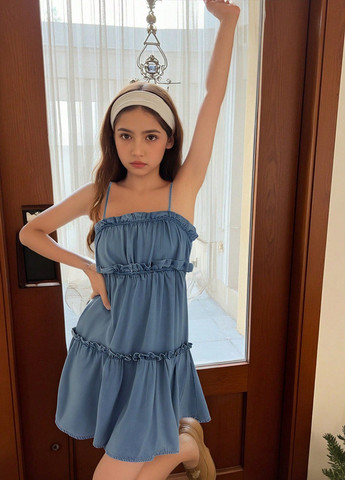 Повсякденне джинсове сукня для дівчаток-підлітків. Сукня з вирізом на тонких бретельках і оборкою внизу. Висока талія та вільний крій. Сукня пошита з джинсової тканини. Машинне прання, хімчистка заборонена.