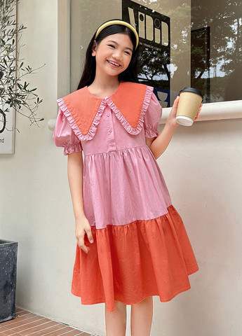 Це сукня міді для дівчаток-підлітків. Воно виконане у милому кольоровому стилі та має вільний крій. Висока талія та оборка внизу. Відкладний комір та рукави-буфи. Тканина не тягнеться. Рекомендації щодо догляду: прання машини або професійна хімчистка.