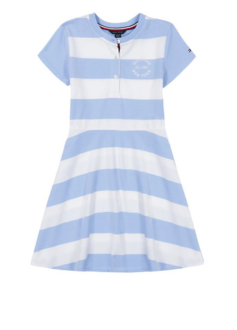 Дитяча сукня Tommy Hilfiger. Сукня для дівчинки з м'якого трикотажу піке. Короткі рукави, виріз круглий. Застібка – планка з гудзиками. Спереду – вишитий логотип, а також на рукаві вишитий фірмовий прапор бренду. Принт – широкі горизонтальні смуги. Відмінна якість.