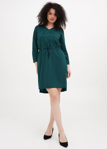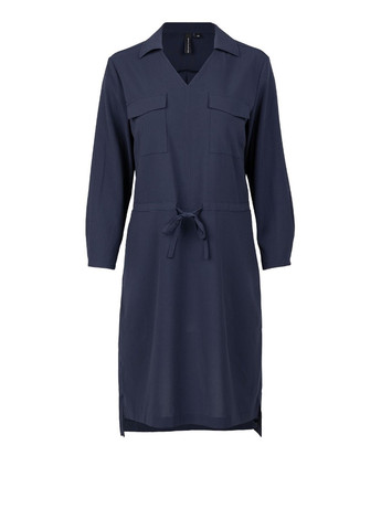 Сукня-пуловер із зав'язками. Без підкладки, V-подібний виріз. Нагрудні кишені із клапанами. Резинка ззаду та зав'язка на талії спереду. Рукав довжиною до браслета із застібкою на гудзик. Бічні кишені у швах. Злегка фігурний поділ із подовженою спинкою. Бічні розрізи.