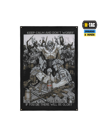 Бренд М-Так випустив новий БАНЕР KEEP CALM 900x1300, присвячений вічній славі та шані до кожного захисника рідної землі. В германо-скандинавській міфології існує повіря, що душі найвідважніших воїнів після смерті потрапляють в місце вічної слави - Вальгаллу. Там вони тренуються, відпочивають, бенкетують та готуються до фінальної битви під проводом богів. Згідно з віруваннями, тільки хоробра смерть на полі бою зі зброєю в руках, давала право потрапити у Вальгаллу, що вважалось для воїнів найбільшою честю. На банері зображено сюжет, на якому український захисник потрапляє в Валгаллу. Там з одним із стародавніх воїнів, він зійшовся в дуелі з армреслінгу, а час до початку поєдинку для них відраховує сам Одін. Написи на принті “KEEP CALM AND DONT WORRY” та “IF YOU DIE THERE WILL BE GLORY” символізують славу для кожного захисника рідної землі, навіть після смерті. Декоративні прапори та банера - це ціла ніша в українській мілітарі культурі. Для бренду М-Так було важливо, створити річ, яка б стала знаковим атрибутом для вас. Банер може стати декоративним символічним елементом, за бажанням ви зможете повісити його на стіну робочого простору, бліндажу, казарми або на стіни своєї квартири. Матеріал банера, дозволяє скласти його досить компактно, що дає змогу брати його на бойові завдання, штурми, перевозити з собою в рюкзаку або сумці. Розмір банера 90 x 130 см, з 4-х сторін оснащений люверсами, для зручності кріплення на стіну. Він зроблений з флажної сітки (100% поліестер 130 гр/м2), краї по периметру підігнуті і прошиті. Розмір: 90 x 130 см; Матеріал: флажна сітка (100% поліестер 130гр/м2); Особливості: люверси по периметру банера.
