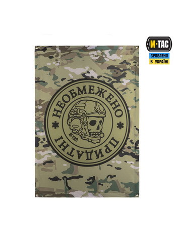 Бренд М-Так представив новий прапор НЕОБМЕЖЕНО ПРИДАТНИЙ 630x900. Тепер цей легендарний дизайн ви зможете побачити не тільки на патчах, а і на прапорі. Декоративні прапори - це ціла ніша в українській мілітарі культурі. Для бренду М-Так було важливо, створити річ, яка б стала символічним атрибутом для вас. Цей прапор за бажанням ви зможете повісити на стіну робочого простору, бліндажу, казарми або стіни своєї квартири. Також є можливість закріпити його на флагшток (за допомогою люверсів) та використовувати як повноцінний прапор. Матеріал прапору, дозволяє скласти його досить компактно, що дає змогу брати його на бойові завдання, штурми, перевозити з собою в рюкзаку або сумці. Сьогодні наші хлопці стикаються з великою кількістю поставлених задач, які виникають під час служби. Багато з них, перебуваючи не перший рік на війні, отримують поранення та контузії, але все одно повертаються в свої частини, аби й надалі нести військову службу та захищати нашу країну від загарбників. На прапорі зображений череп у військовій амуніції та напис “необмежено придатний”, що уособлює силу та непохитність духу хлопців, які навіть в тяжких умовах продовжують до кінця виконувати великий обсяг військових завдань. Розмір прапору 63*90 см, у місцях кріплення до флагштоку - два люверса (верхній і нижній), краї по периметру підігнуті і прошиті. Прапор зроблений з флажної сітки (100% поліестер 130гр/м2). Розмір: 63*90см Матеріал: флажна сітка (100% поліестер 130гр/м2) Особливості: Люверси для кріплення флагштоку
