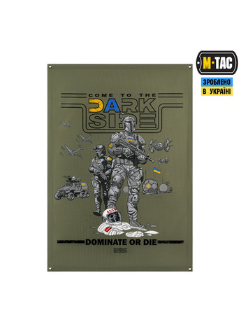 Бренд М-Тас створив новий БАНЕР UA SIDE 630X900, присвячений патріотизму та незалежності України від радянського минулого. Декоративні прапори та банера - це ціла ніша в українській мілітарі культурі. Для бренду М-Так було важливо, створити річ, яка б стала знаковим атрибутом для вас. Банер може стати декоративним символічним елементом, за бажанням ви зможете повісити його на стіну робочого простору, бліндажу, казарми або на стіни своєї квартири. Матеріал банера, дозволяє скласти його досить компактно, що дає змогу брати його на бойові завдання, штурми, перевозити з собою в рюкзаку або сумці. На принті зображені українські космодесантники зі зброєю в руках, які знаходяться на захопленому ворожому плацдармі. Під ногами у них – засипаний піском пострадянський мотлох. Це зображення ілюструє відокремленість нашої країни від руїн великої імперії. Зверху принта розміщений напис “COME TO THE DARK SIDE” (Переходь на темну сторону), а знизу - DOMINATE OR DIE” (домінуй або помри). Вони - є символом спротиву та безкомпромісності в боротьбі за нашу незалежність. Розмір банера 63*90 см, з 4-х сторін оснащений люверсами, для зручності кріплення на стіну. Він зроблений з флажної сітки (100% поліестер 130 гр/м2), краї по периметру підігнуті і прошиті. Розмір: 63*90см Матеріал: флажна сітка (100% поліестер 130гр/м2) Особливості: Люверси по периметру банера