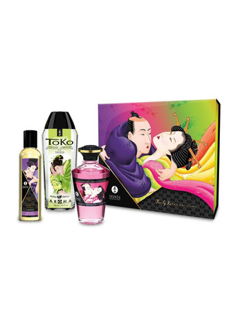 Набір Shunga Fruity Kisses – це набір для найвишуканішої сексуальної прелюдії з ягідно-фруктовим смаком та екзотичним ароматом. Піднесіть свої почуття до нових висот – влаштуйте божевільну прелюдію з фруктовим міксом. До набіру входить: Масажна олія Shunga Libido – Exotic Fruit (250 мл). Розігрівальна олія Shunga APHRODISIAC WARMING OIL – Raspberry Feeling (100 мл). Лубрикант на водній основі Shunga Toko AROMA – Melon Mango (165 мл).