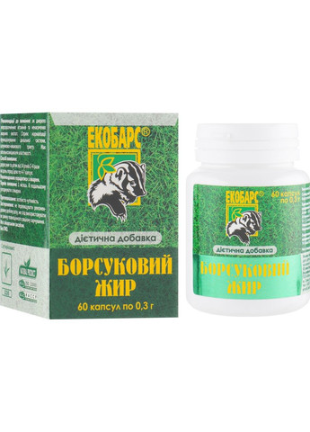 Спеціалізуючись на виробництві біологічно активних добавок бренд «Екобарс» заслуговує на цілковиту довіру. Не даремно саме він одним з перших виробників спеціальних харчових продуктів на українському ринку отримав відповідне свідоцтво про реєстрацію. Хочете поліпшити стан шкіри, волосся, нігтів, обмін речовин і роботу серцево-судинної системи? На допомогу прийде універсальний засіб – дієтична добавка «Борсуковий жир» в капсулах, що є джерелом необхідних організму жиророзчинних вітамінів і ненасичених жирних кислот. Особливості дієтичної добавки від «Екобарс»: - благотворно позначається на стані шкіри, насичує її необхідними живильними речовинами, надає м'якість, ніжність, еластичність і прискорює процеси регенерації;- завдяки антиоксидантній дії запобігає появі передчасних зморшок;- зміцнює нігті і волосся, надає їм природний блиск;- прискорює метаболізм і покращує роботу шлунково-кишкового тракту;- активізує процеси відновлення тканин, прискорюючи загоєння виразок і ерозій;- покращує роботу серцево-судинної системи, знижуює ризик розвитку атеросклерозу і тромбозів;- знижує рівень холестерину в крові.
