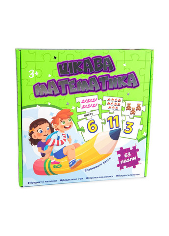 Навчальні пазли для дітей від 3 років Цікава математика Strateg Навчальні пазли «Інтерасна математика» призначені для знайомства дитини з цифрами та числами. Граючи з пазлами, малюк зможе складати числові ряди, з'єднувати предметні малюнки з числами та порівнювати їх між собою. Цей розвивальний набір сприяє комплексному розвитку дитини, впливаючи на логічне мислення, дрібну моторику та пам'ять. Пазли ідеально підходять для використання вдома, у дитячому садку та на ігрових майданчиках, роблячи процес навчання захопливим і різноманітним. Набір містить 63 пазли й інструкцію з кількома іграми, що дає змогу дітям вчитися в ігровій формі. Переваги навчальних пазлів Розвивальна іграшка для дітей сприяє: розвитку логічного мислення; покращенню дрібної моторики; розвитку пам'яті; збільшення цікавості до математики. Застосування й вік Рекомендований вік для гри — від 3 років. Пазли підходять як для індивідуальної гри, так і для спільного навчання з друзями або батьками. Вони можуть використовуватися в освітніх установах як навчальний посібник. Характеристики навчальних пазлів Тип товару: розвивальні пазли; Для кого (вікон, підлога): від 3 років, для хлопчиків і дівчаток; Тематика або персонажі: математичні символи та цифри; Матеріали: картон; Комплектація/формат: 63 пазла, інструкція; Призначення: навчання математики, розвиток логіки; Розміри/габарити: 25х26х5 см; Додаткові особливості: гра українською мовою, підходить для занять у садках.