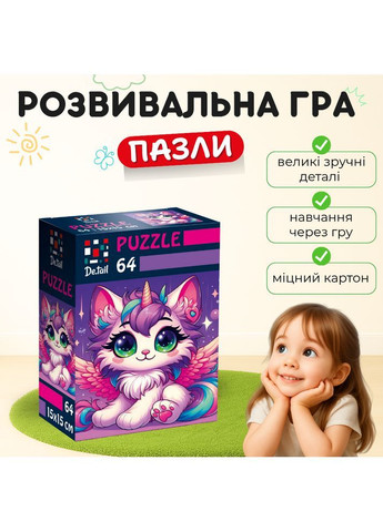 Пориньте у фантастичний світ з пазлом “Крилате кошеня”! Деталізоване зображення у яскравих кольорах неодмінно сподобається дитині. Оптимальна кількість пазлових елементів, 64 штуки, для дитини віком від 5 років. Розвиток навичок: дрібна моторика, координація рухів, логічне мислення, увага, пам’ять, посидючість. Вік: від 5 років. Матеріал: картон. Розмір пазлової картинки: 15 х 15 см.
