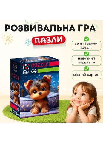 Пориньте у світ домашніх тваринок з пазлом “Допитливе цуценя”! Деталізоване зображення милого цуценяти йоркширського тер’єра у насичених кольорах неодмінно сподобається дитині. Оптимальна кількість пазлових елементів, 64 штуки, для дитини віком від 5 років. Розвиток навичок: дрібна моторика, координація рухів, логічне мислення, увага, пам’ять, посидючість. Вік: від 5 років. Матеріал: картон. Розмір пазлової картинки: 15 х 15 см.