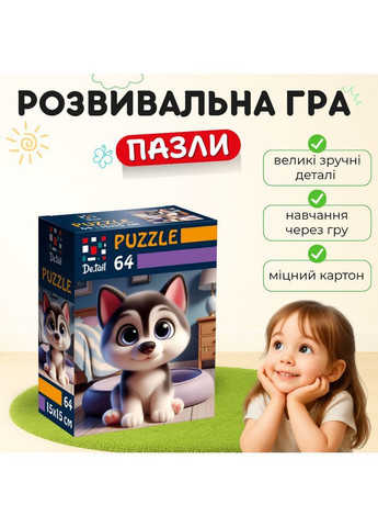 Пориньте у світ домашніх тваринок з пазлом “Малий хаскі”! Деталізоване зображення милого цуценяти хаскі у насичених кольорах неодмінно сподобається дитині. Оптимальна кількість пазлових елементів, 64 штуки, для дитини віком від 5 років. Розвиток навичок: дрібна моторика, координація рухів, логічне мислення, увага, пам’ять, посидючість. Вік: від 5 років. Матеріал: картон. Розмір пазлової картинки: 15 х 15 см.