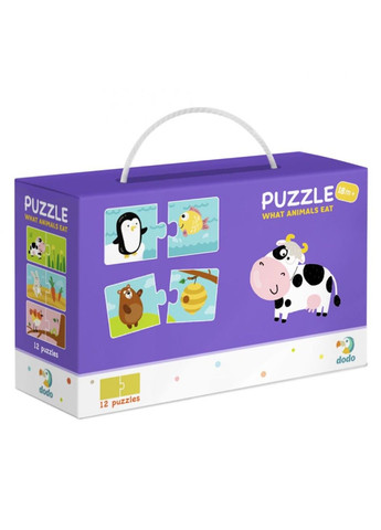 В коробці 12 пазлів, кожен з котрих складається з двох елементів, треба зєднати елементи так, щоб кожній тваринці відповідала її їжа. Вік: від 18 місяців Кількість елементів: 24 Розмір зібраного пазла: 13х6,5 см Розмір коробки: 12х18х6 см