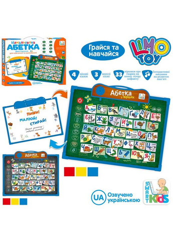 Інтерактивний навчальний музичний Планшет Дошкільник SK0023 A – креативна та логічна іграшка, за допомогою якої дитина навчиться розвивати свої творчі здібності. Також планшет сприяє розвитку мови дитини, уважності, логічного мислення, креативності, слуху та посидючості. Ідеальний подарунок як діткам, які тільки починають розмовляти, так і дітям, які вже починають виявляти інтерес з письма та рахунку. Характеристики: Рекомендований вік: 3-х років; Мова озвучування: українська; Розміри упаковки: 19.5 х 22 х 4.5 см; Розміри іграшки: 16.5 х 11 см; Живлення: батарейки 3 х АА (не входить до комплекту); Матеріал: пластик; Вага: 0.22 кг Особливості: музичний планшет має вісім режимів роботи; монохромний дисплей 8х3 см.; дитина в ігровій формі вивчатиме літери, слова, цифри, рахунок, слухатиме пісеньки (алфавіт, букварик) та вірші (43 вірші); веселі ігри: "знайди цифру - букву", "сума-різниця в межах 10-ти, скільки буде ...?"; планшет розвиває дрібну моторику, комунікабельність, логічне мислення, звукове, візуальне та колірне сприйняття, фонематичний слух, уважність, посидючість, пам'ять та уяву.