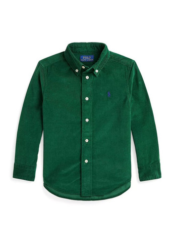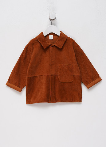Дитяча сорочка зі світлого вельвету з довгими рукавами. Вона має класичний комір, кнопкові застібки спереду та накладну кишеню. Має класичний комір і довгі рукави із застібками на манжетах. На ліктях розташовані контрастні сіро-зелені накладки.