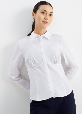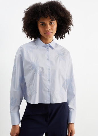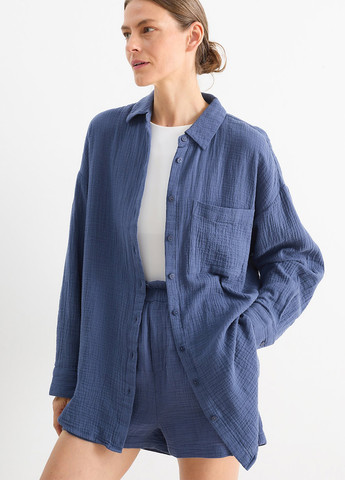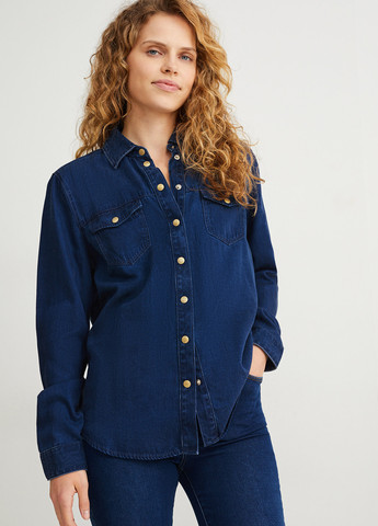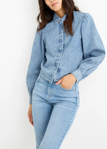 Джинсова сорочка з легкого деніму з ефектом прання. Плечі та манжети рукавів на 1 ґудзику з дрібними складками. Довжина по спинці приблизно 53 см, довжина рукава приблизно 63 см у розмірі M; довжина по спинці приблизно 52 см, довжина рукава приблизно 62 см у розмірі S.