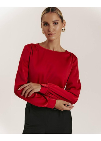 Жіноча блуза з гладкого атласу насиченого червоного кольору. Має прямий крій, що не облягає тіло та забезпечує вільну посадку. Довгі рукави зібрані на манжети, які фіксуються маленьким білим ґудзиком. Застібка розташована ззаду — невеликий розріз у верхній частині спини доповнений акуратним ґудзиком. Комір округлої форми, поверхня тканини має характерний блиск. Блуза підходить для повсякденних і більш формальних образів.