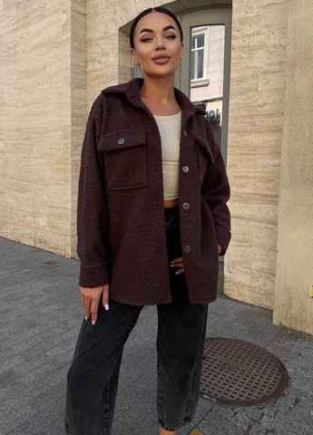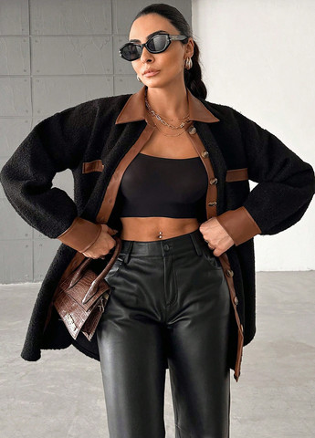 Куртка-сорочка Тедді із заниженими плечима та контрастною обробкою має комір. У неї довгі рукави із заниженою лінією плечей, виконана з нееластичної тканини.