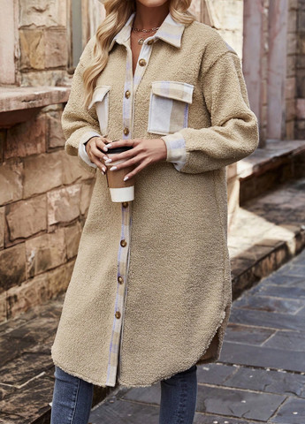Куртка-сорочка SHEIN Essnce Teddy Jacket має довгі занижені рукави та стандартну посадку. Має однобортну планку на ґудзиках із контрастним оздобленням спереду та деталь кишені. Конструкція включає візерунок з кольоровим блоком, виріз коміра сорочки і підходить для повсякденного носіння.