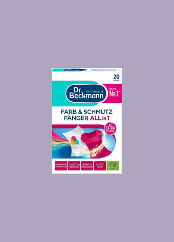 Серветки Dr. Beckmann 3in1 Серветки Dr. Beckmann для поглинання кольору при пранні 3in1 Farb & Schmutz Fänger 3in1, 1 шт. Серветки забезпечують максимальну ефективність уловлювання кольору. Для чого потрібні серветки: Під час кожного прання у воді, окрім молекул забруднюючих речовин, збираються вимиті барвники, які можуть зафарбовувати інші тканини. Серветки діють як магніт, що притягує барвник, піну та бруд, які плавають у воді. Таким чином, одяг, що переться, не забарвлюється. Рекомендації: Підходять для кольорових тканин. Високоефективна фіксація кольору всередині серветок забезпечує миттєвий захист у воді. Спосіб застосування: Заповніть пральну