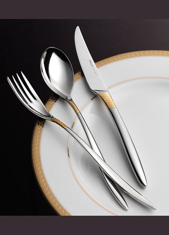 Набір елітних столових приборів HISAR Platinum Cordon Matt. Матована ручка оригінальної форми. Столові прибори виготовлені з високоякісної нержавіючої сталі 18/10, виробленої на заводах German Krupp Thyseen’s. Три етапи полірування, плюс остаточна ручна, надають виробу неповторний блиск і роблять зовнішнє покриття більш стійким і довговічним. З часом не тьмяніє і не забарвлюється при контакті з їжею. Сертифіковане на Україні. У набір входить: 6 столових виделок, 6 столових ложок, 6 столових ножів і 6 чайних ложок. Упаковано в красиву чорну оксамитову подарункову коробку.
