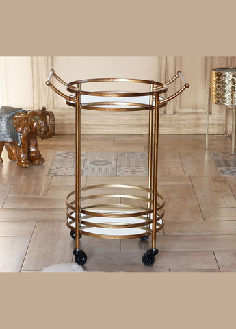 Сервірувальна столик-вірний помічник господинь. Дуже зручний, функціональний, не займе багато місця. Ну і досить пристойний, так що запросто підійде як декоративний елемент інтер'єру. Призначений для обслуговування гостей. Може бути підставкою для вази, книг та іншого. А також, використовуватися в якості додаткової робочої поверхні на кухні. На нього можна поставити солодощі і фрукти. Має металевий корпус золотого відтінку, з дзеркальними круглими підставами, на колесах. З боків верхньої стільниці приєднані ручки для зручності переміщення столика. Кількість в упаковці 1 шт. Кількість в ящику 1 шт.