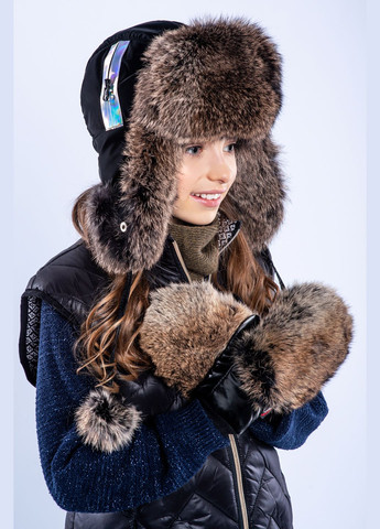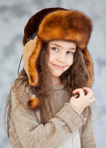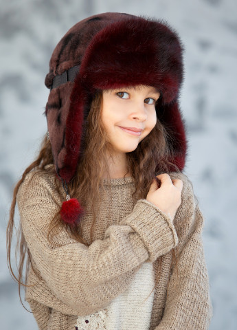 Вушанка з плащової тканини, натуральне хутро кролика з окрасом, подвійним шар утеплювача, бавовняна підкладка. На вушках є кнопки, вушка можно пристебнути. Щоб підібрати потрібний розмір, треба поміряти коло голови над рівнем бровей. Зима.