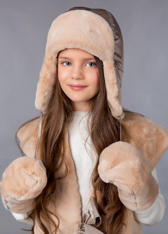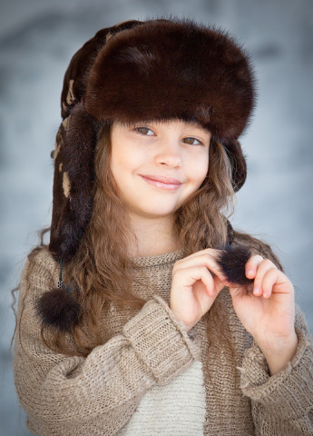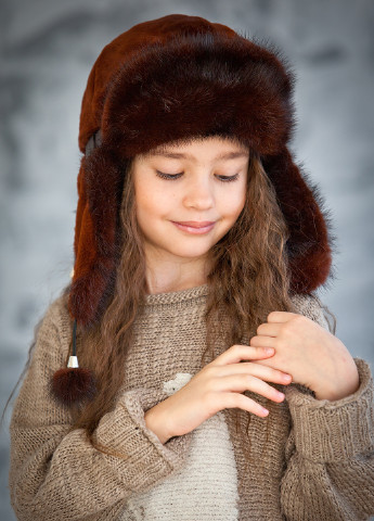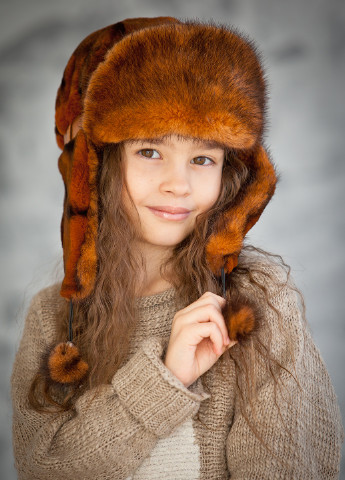 Вушанка з плащової тканини, натуральне хутро кролика з окрасом, подвійним шар утеплювача, бавовняна підкладка. На вушках є кнопки, вушка можно пристебнути. Щоб підібрати потрібний розмір, треба поміряти коло голови над рівнем бровей. Зима.